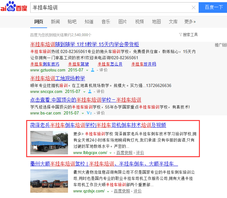 關(guān)鍵詞“半掛車培訓(xùn)”在百度排名:第1頁第1名
