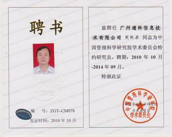 為表彰廣州通科信息技術有限公司CEO 周照渠先生對網絡營銷及管理方面的突出貢獻,中國中國管理科學研究院特聘周照渠先生為中國管理科學研究院學術委員會特約研究員。